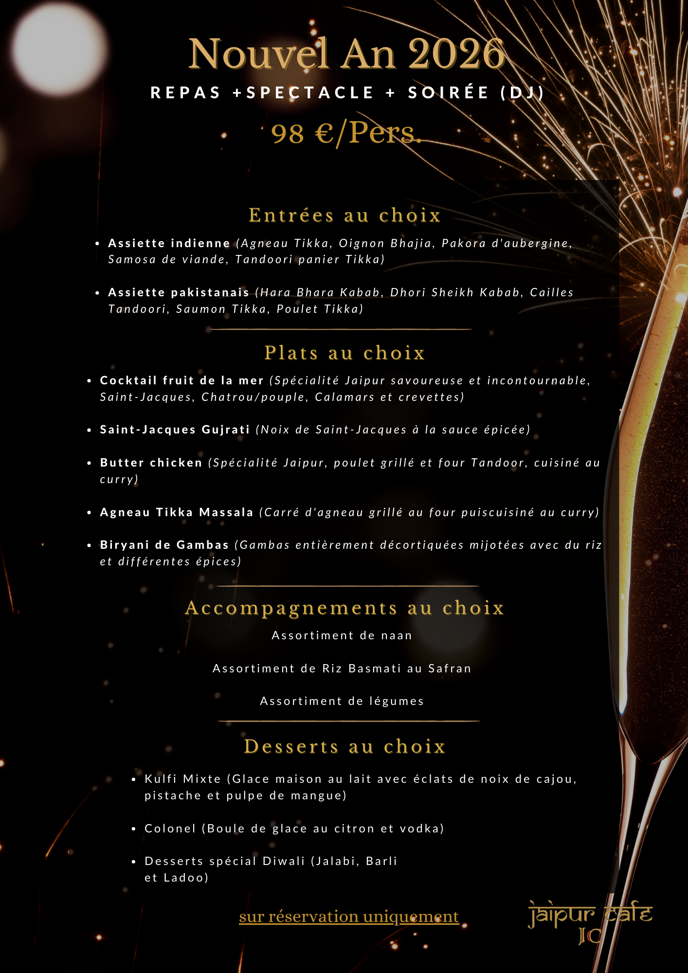 Comme chaque année, le Jaipur Café vous réserve une soirée avec un menu d'exception et une ambiance de folie ! Une animation Bollywood pendant le repas et pour finir, un DJ pour que vous puissiez profiter de la piste de danse !